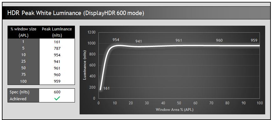 Peak white luminance reached up to 961 nits maximum which was well beyond the listed 600 nits spec and offers a high luminance potential in HDR content. The panel is capable of sustaining this luminance for all APL scenes thanks to the LED backlight which doesn’t have the same limitations and need for ABL that an OLED panel does. Remember this is the capability of the backlight, and in real-world content the actual target luminance will vary. You’re not really going to reach a 960 nits full screen white in real content as it wouldn’t be mastered in that way.