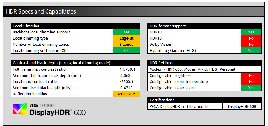 - VESA DisplayHDR 600 certification and 8-zone edge lit local dimming