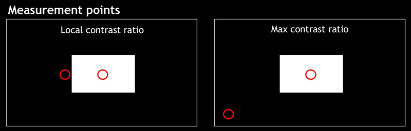 | Local dimming | Luminance (nits) | Local black depth (nits) | Local contrast ratio (:1) | Min black depth (nits) | Max contrast ratio (:1) |