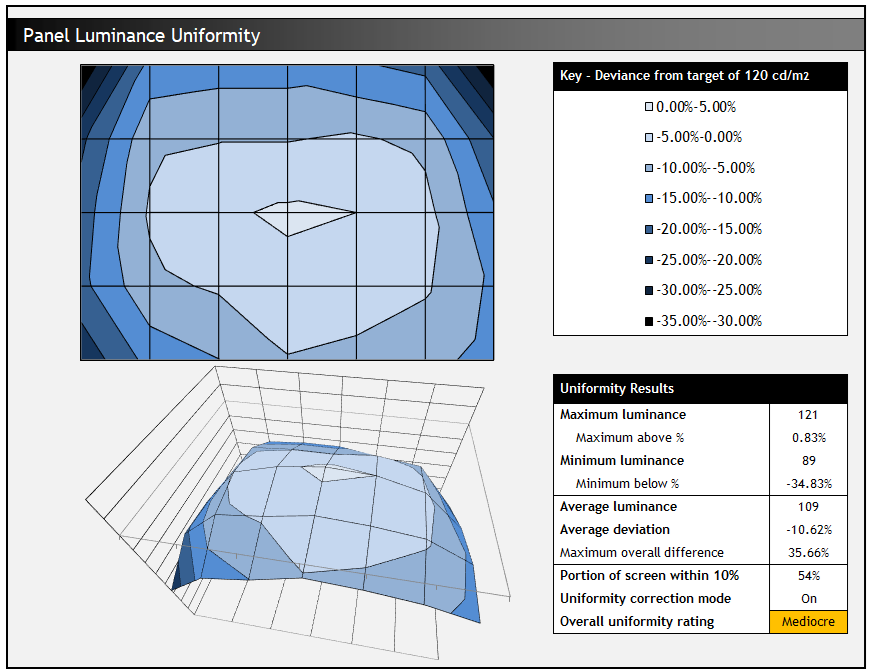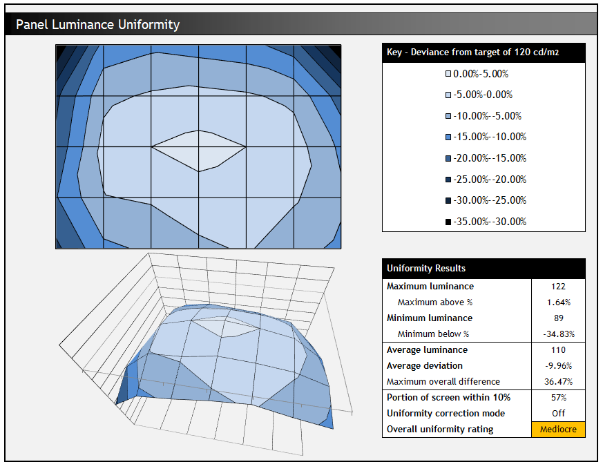 In practice you could occasionally see darker bars along the left and right hand sides of the screen but only really evident when viewing certain darker and duller colour test patterns or backgrounds. For brighter coloured or lighter grey tests these darker areas were not really visible, and in normal varied and dynamic content there was no real issue either. If you’re specifically working with uniform colour blocks or images, you may need to be mindful of this but we expect for most people you would be unlikely to see issues during normal day to day usage. Uniformity could also vary between different samples.