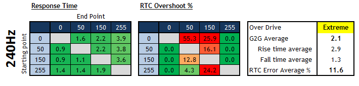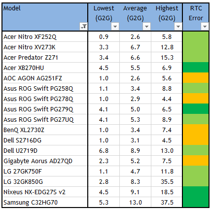 We have provided a comparison above against other models we have tested to give an indication between screens. The screens tested are split into two measurements which are based on our overall display lag tests (using SMTT) and half the average G2G response time, as measured by the oscilloscope. The response time is split from the overall display lag and shown on the graph as the green bar. From there, the signal processing (red bar) can be provided as a good estimation.