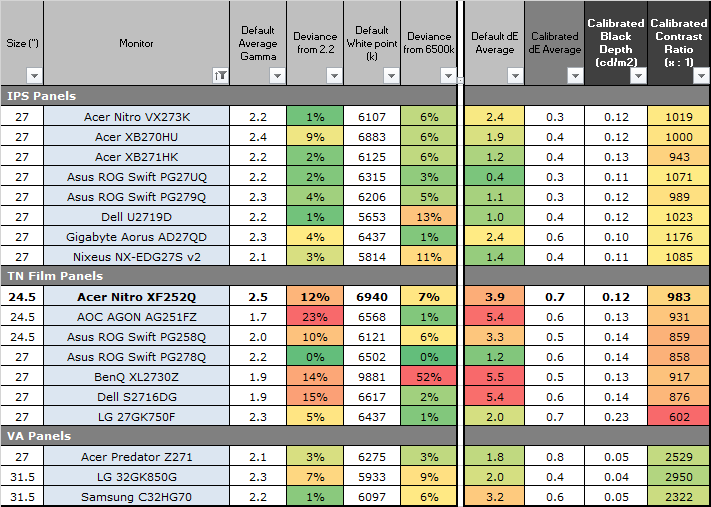The Acer XF252Q was an impressive gaming screen for sure. It's the fastest panel we've tested to date in fact, with the lowest, most consistent response times, no noticeable overshoot, support for 240Hz refresh rate natively, support for FreeSync and G-sync, very low input lag; and even a nice, working motion blur reduction backlight option. We were certainly impressed by its gaming performance with super motion clarity, smooth motion and a snappy feel. It's quite a bit smaller than most screens we are used to and the lower 1080p resolution is a bit of a step down from common 1440p displays, certainly for other non-gaming uses. However, it is still a popular screen size and the system drain of running 1080p @ 240Hz is of course much less than if it were 1440p @ 240Hz.