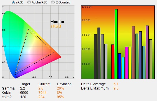 The CIE diagram on the left confirms that the monitors colour gamut (black triangle) very closely matches the sRGB colour space (orange triangle). It extends a little past the sRGB space in blues and greens in this 2D view of gamut but is a little short in reds.