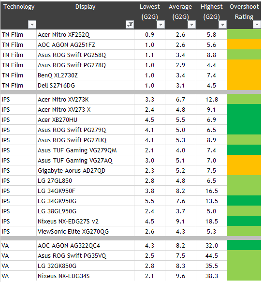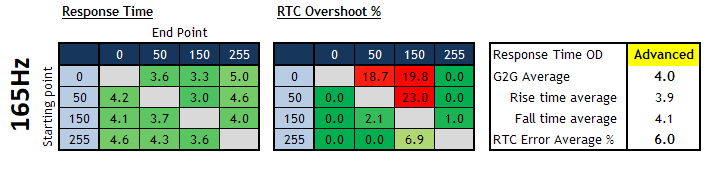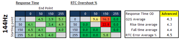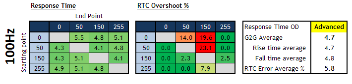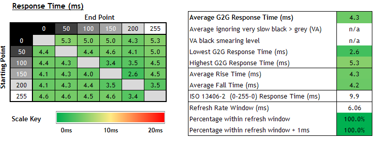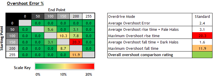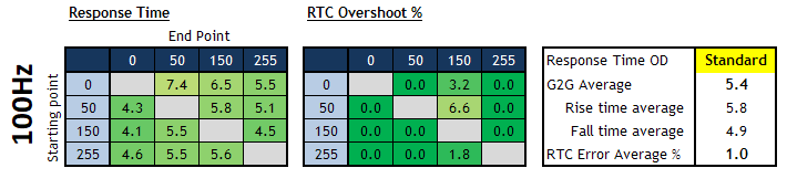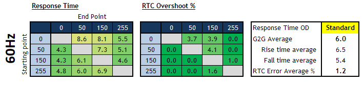 Response times are excellent overall with no noticeable overshoot when using the optimal response time settings. Stick to the 'standard' response time setting for all refresh rates. Even at 60Hz the response times are decent.
