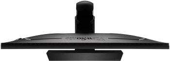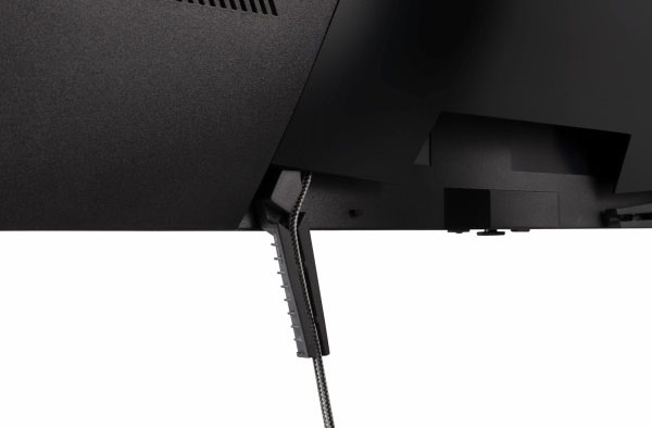 The back of the screen is encased in a matte black plastic for a fairly simple design. The stand connects in to the middle with a quick release mechanism and is a pretty chunky but very sturdy design. There is a cable tidy hole in the back of the stand, and the foot is black metal. There is a headphone hook which can be folded down if you need it on the right hand side of the screen (when viewed from the back as above).