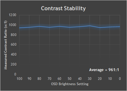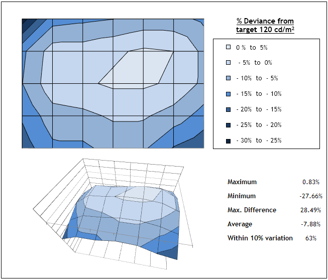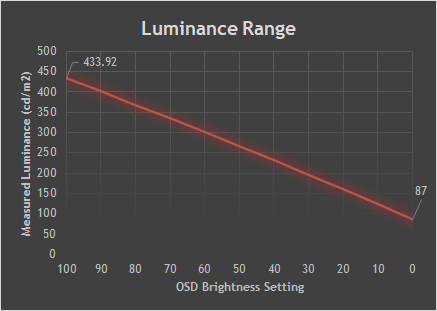 Good adjustment range offered including a fairly high peak brightness. Flicker free backlight operation with no PWM