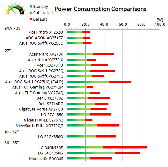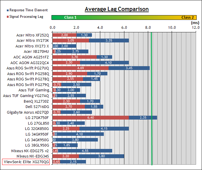 The total lag measured was a very impressive 2.80 ms total. The pixel response times should account for pretty much all of that display lag at around 2.15ms, and so we can say that there appears to be almost no added signal processing lag on this screen at around 0.65ms. This is expected given the use of a hardware G-sync module which pretty much guarantees no lag. An impressive result from this display and making it suitable for fast and competitive gaming.